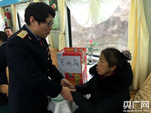 南京開往昆明的K155次列車列車長王華在安慰不慎遺失錢的旅客楊曉艮。