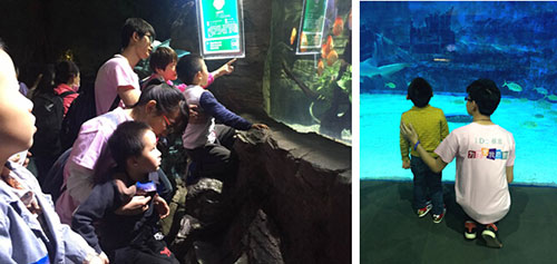 活動(dòng)當(dāng)天,孩子們?cè)诩议L(zhǎng)和志愿者的陪同下,一同參觀了北京海洋館。造型獨(dú)特的海洋館猶如一只藍(lán)色的大海螺,靜臥在綠樹(shù)環(huán)抱、花團(tuán)簇?fù)淼纳碁┥。在志愿者的解說(shuō)和引導(dǎo)下,“雨林奇觀”、“鯊魚小鎮(zhèn)”、“白令海峽”、“國(guó)寶中華鱘魚館”、“海底環(huán)游”、“鯨豚灣”、“海洋劇院”七個(gè)主題展區(qū)一一展現(xiàn)在眼前,孩子們仿佛被喚醒般漸漸從自己的小世界脫離出來(lái),雙瞳閃爍著晶亮的光彩,追尋著眼前流動(dòng)的神奇世界。