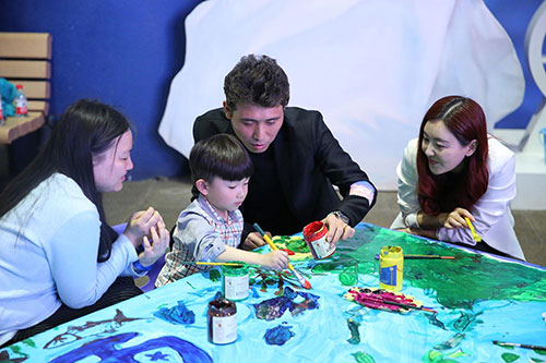 I Do基金愛(ài)心天使馬艷麗、李乃文、張皓然、極客少年團(tuán)(李歌洋、萬(wàn)翔、馬爾辰)也來(lái)到了活動(dòng)現(xiàn)場(chǎng),與孩子們互動(dòng)游戲,觀看精彩的海豚表演,并且一起用畫筆描繪心中的大海。深邃遼闊的幽暗海洋、魚群、水草、蝦蟹……充滿純真童趣的畫布漸漸被涂滿色彩,而整個(gè)會(huì)場(chǎng)仿佛變成了游樂(lè)園,充滿孩子們的歡笑聲。