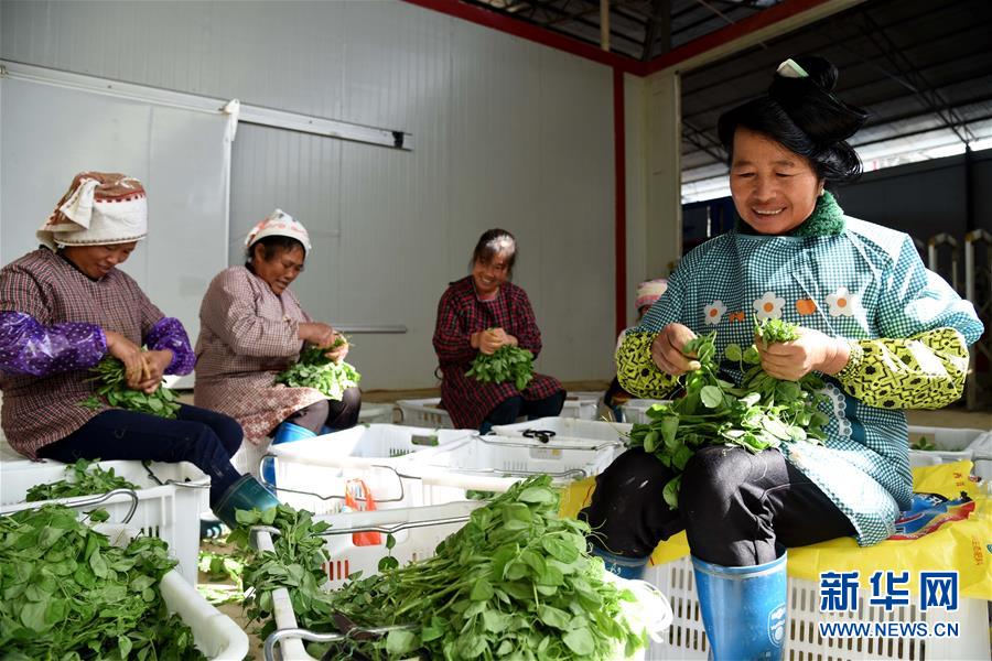 11月25日,在貴州省黔東南苗族侗族自治州榕江縣,當?shù)貗D女在三鑫天源生態(tài)農(nóng)業(yè)公司整理蔬菜。