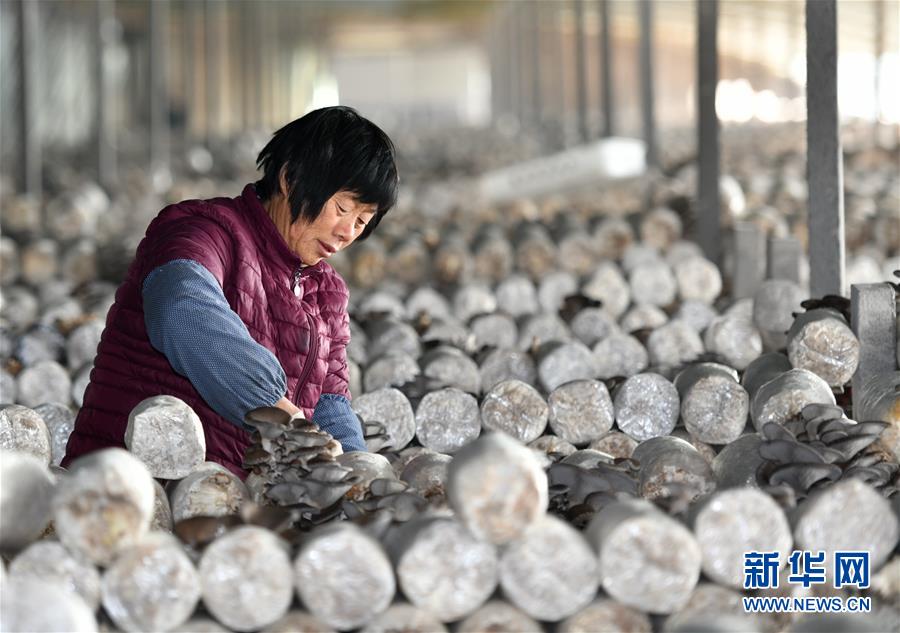 12月18日,山東省高青縣花東村村民在采摘平菇。
