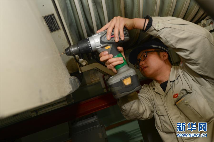 地勤機(jī)械師邱紀(jì)盛在動車組連接端對風(fēng)擋下方鉚接螺釘進(jìn)行重新安裝(2月19日攝)。