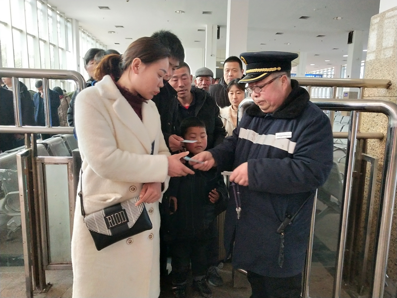 在宿州站一樓候車室,旅客們會經(jīng)?吹揭粋身材略胖,個頭不高,帶著一副老花鏡,總是面帶微笑服務的客運員,他就是鄭桂芝,主要負責一樓候車室旅客進站上車檢票和候車室巡視等。今年春運是老鄭的最后一個春運,再過幾個月他就要退休了,老鄭說:“這是我從事鐵路工作的最后一個春運,也將是我生命中最難忘的一次春運,因此,我格外珍惜與大伙在一起的日子,等我退休后,我還要來做志愿者,為車站為旅客奉獻一點微薄之力”。質(zhì)樸的話語中流露出他對同事和崗位的依依不舍。