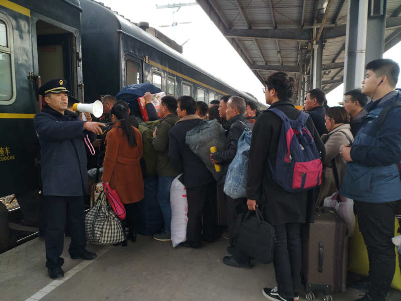 (鄭利軍帶領(lǐng)黨員突擊隊到重點車車門口疏導旅客上車,加快旅客上車速度。)