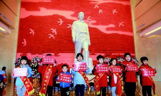 2018年寒假,“小小志愿者”在湖南雷鋒紀(jì)念館開展文明勸導(dǎo)活動,背景是以雷鋒在家鄉(xiāng)長沙望城當(dāng)公職人員的形象為原型的塑像。(湖南雷鋒紀(jì)念館供圖)