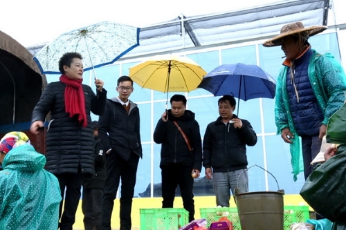 (段惠仙冒雨查看人參果交易情況。)