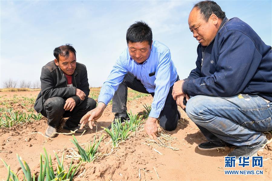 4月3日,在道勞呼都格嘎查,郭鴻嶂(中)在地里指導村民了解紅蔥生長狀況。