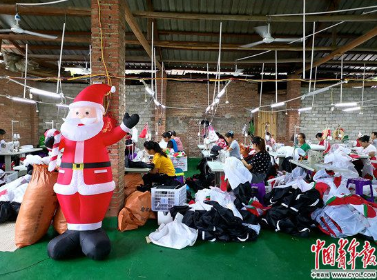 某個美國餐廳網(wǎng)上訂購的圣誕老人充氣玩具,此刻可能正在貴州山區(qū)的扶貧車間里緊鑼密鼓地加工著。7月8日,記者在貴州省黔東南州黎平縣九潮鎮(zhèn)的扶貧車間看到,許多年輕人從留守務(wù)農(nóng)、在外打工變成家鄉(xiāng)車間里的技術(shù)工人,他們每人每月平均會有兩三千元穩(wěn)定收入,也有更多時間陪伴孩子、照顧家庭。工廠有穩(wěn)定的外貿(mào)訂單,互聯(lián)網(wǎng)讓村子連通世界,也找到脫貧奔小康的新路。(記者 白皓)