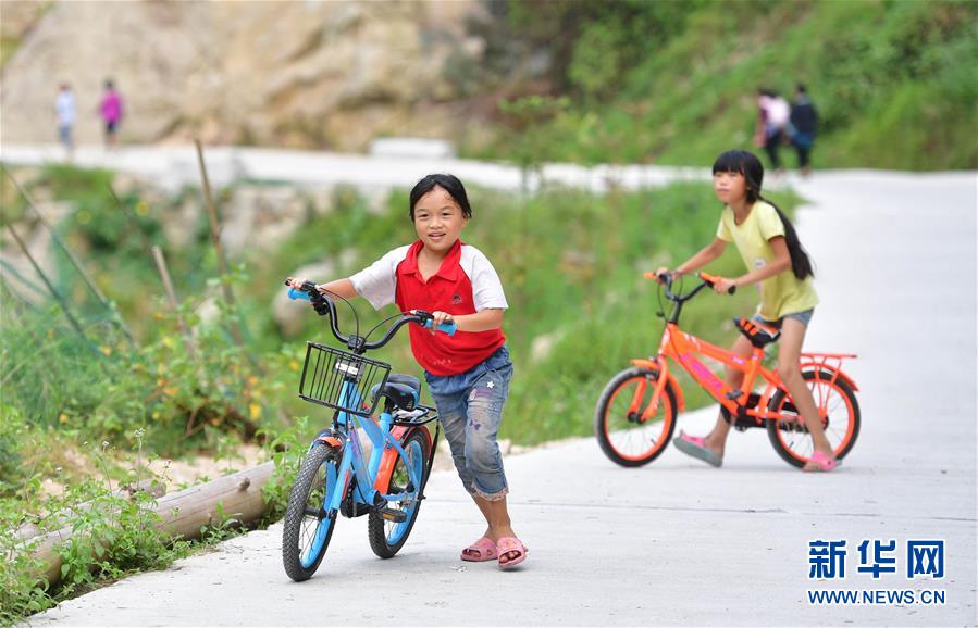 烏英苗寨的女孩在騎自行車(8月19日攝)。