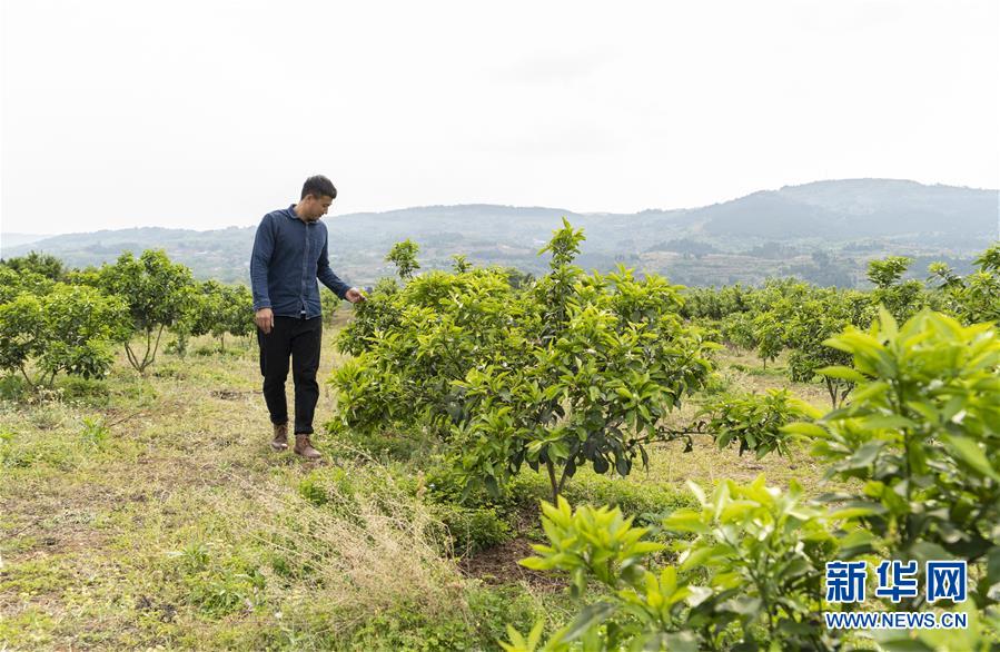 4月25日,肖欽仁走過成都金堂縣趙家鎮(zhèn)陽河街社區(qū)的一片果園。 新華社記者 李夢馨 攝