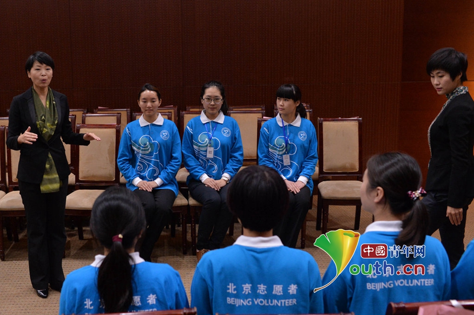 2014年10月24日,北京,志愿者在進(jìn)行形體和禮儀的相關(guān)培訓(xùn)。圖片作者:京華時報 王苡萱/CFP