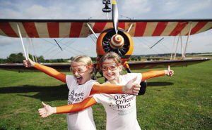 她們是來自英國的表姐妹羅絲·鮑威爾和弗拉姆·布魯爾。兩人被安全裝置固定在祖父的古董雙翼飛機上,以每小時160公里的速度飛過格洛斯特郡上空。