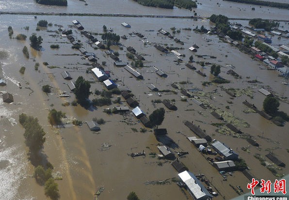 8月26日,黑龍江同江段地方搶險(xiǎn)持續(xù)進(jìn)行。圖為航拍的黑龍江同江段災(zāi)情。中新社發(fā) 楊再新 攝