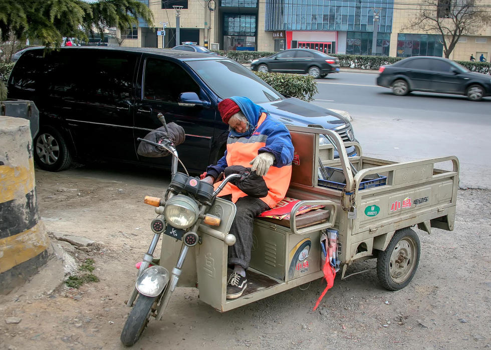 2016年2月21日,江蘇省徐州市,一位年邁的環(huán)衛(wèi)工老奶奶把大街上的紙屑和垃圾打掃的干干凈凈,清理完畢后,疲勞地坐睡在路旁的電動三輪車座位上。