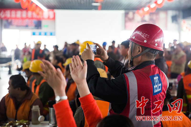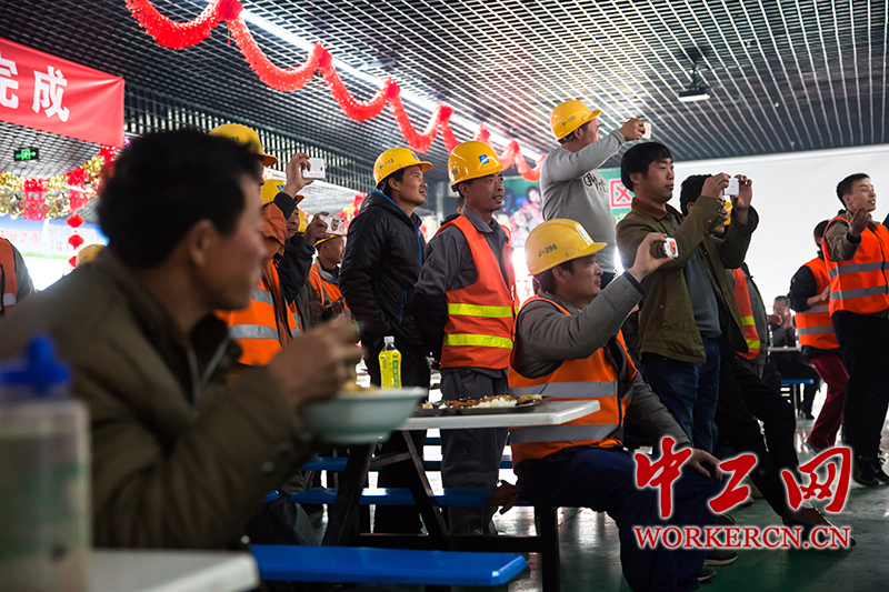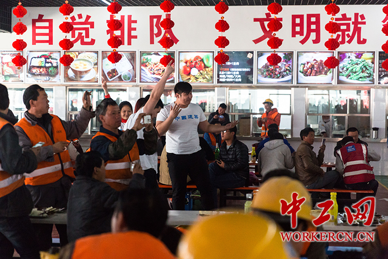 歌曲唱罷,一個人拿起喇叭喊話,“你干嘛呢?”另一個人拿著掃帚說,“我在學(xué)雷鋒呢”,話音剛落,從食堂的四面八方聚集一群演員,跳起了歡快的舞蹈。現(xiàn)場的農(nóng)民工兄弟紛紛拿出手機(jī),記錄下這驚喜的一幕!八麄儾恢缽哪睦锩俺鰜淼模@喜,太感動了,我已經(jīng)錄下來了,回家給我家里人瞧瞧”。這是現(xiàn)場的一位農(nóng)民工兄弟告訴主辦方的,F(xiàn)場,還有許多農(nóng)民工兄弟們被熱烈的氣氛鼓舞,與演員們一起互動,一起跳舞,一起歌唱,非常開心!≈泄ぞW(wǎng)記者李雪峰 攝 -