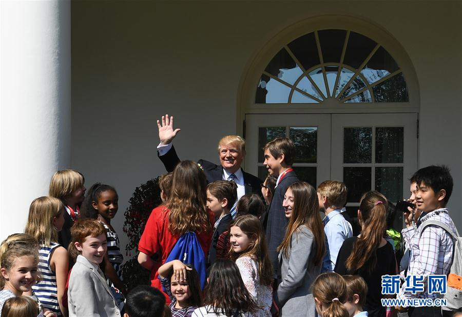 4月27日,在美國(guó)華盛頓白宮玫瑰園,美國(guó)總統(tǒng)特朗普(中)和參加活動(dòng)的孩子們打招呼。