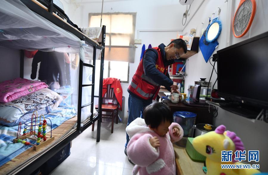 12月18日,在廣西鹿寨縣拉溝鄉(xiāng)六章村,朱彪在宿舍里給女兒朱家儀沖泡奶粉。