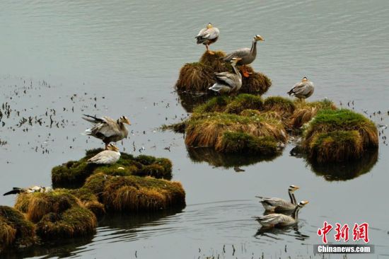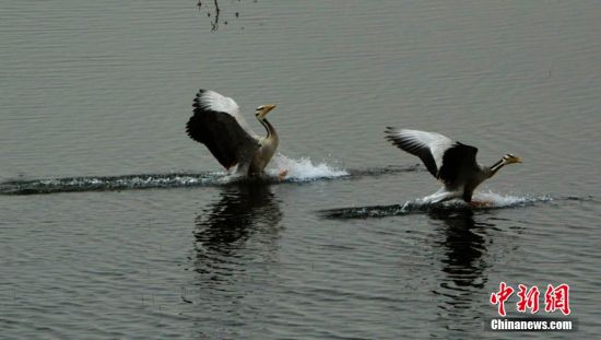 甘肅省肅北蒙古族自治縣鹽池灣國家級自然保護區(qū)分布著8個明鏡般的湖泊,這里以濕地、沙地、草原及高原等多樣化的生態(tài)系統(tǒng)為主。每年該保護區(qū)境內(nèi)河流、湖泊冰雪消融、萬物蘇醒,上萬只黑頸鶴、斑頭雁、大天鵝、赤麻鴨等候鳥陸續(xù)從南方飛抵保護區(qū),在這里大量繁殖。圖為斑頭雁。烏仁花 攝