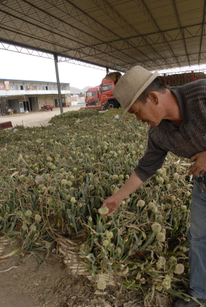 洋蔥的價格從兩周前的每斤0.60元一下子跌到每斤0.15元,這讓批發(fā)商韓先生始料未及。