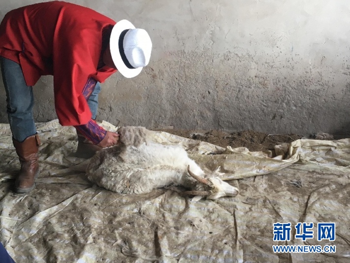 鹽池灣草原上的抓絨季開始了。手持絨梳,不停地在山羊身上耙來耙去,不到半小時,四肢被捆、仰面朝天的山羊就脫掉了去冬以來一直穿在身上的羊絨“大衣”。巴依爾·道爾吉這幾天的主要工作就是抓絨。