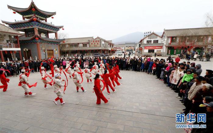1月20日,在甘肅平?jīng)鍪嗅轻脊沛?zhèn),游客觀看新春民俗活動中的安塞腰鼓表演。新華社發(fā)(吳希會 攝)