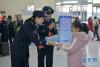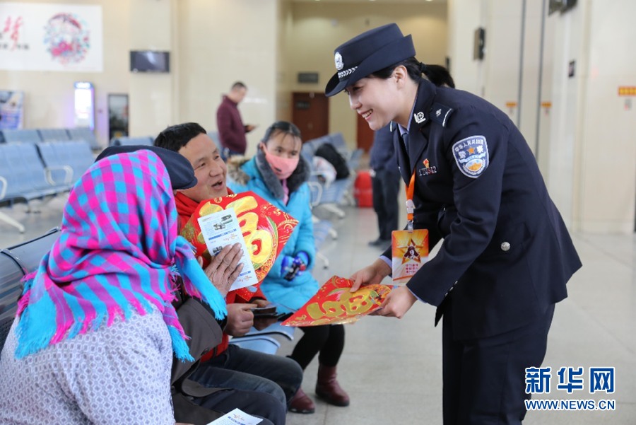 1月21日,蘭州鐵路公安局武威公安處民警向旅客贈送對聯(lián)。當(dāng)日,2019年鐵路春運(yùn)大幕正式拉開,蘭州鐵路公安局武威公安處在轄區(qū)車站開展以“平安、有序、溫馨”為主題的宣傳活動,出動警力500余人次,在轄區(qū)金昌站、張掖站、嘉峪關(guān)南站、酒泉南站、敦煌站等28個客站設(shè)立安全宣傳服務(wù)點(diǎn),向旅客普及實(shí)名制購票安全、火車出行安全防范知識、危險品知識,并現(xiàn)場送祝福送對聯(lián),提供法律咨詢服務(wù),切實(shí)提高旅客自身安全防范意識,護(hù)衛(wèi)旅客平安回家路。新華網(wǎng)發(fā)(劉東帥 攝) -