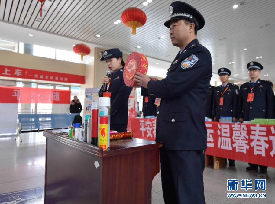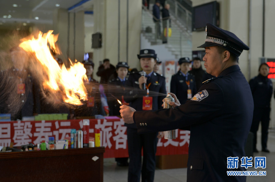 1月21日,蘭州鐵路公安局武威公安處民警現(xiàn)場演示限制攜帶物品的危險性。新華網(wǎng)發(fā)(劉東帥 攝) -