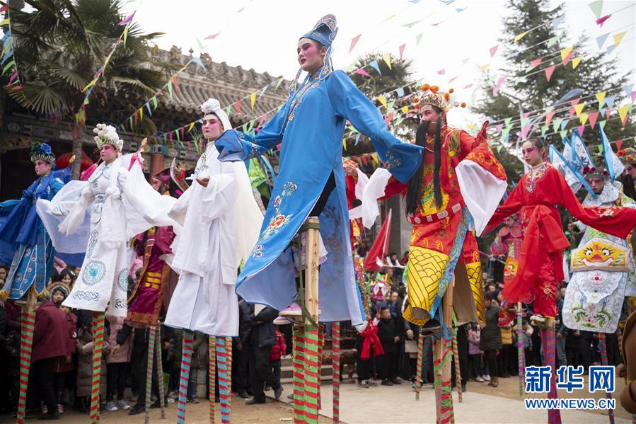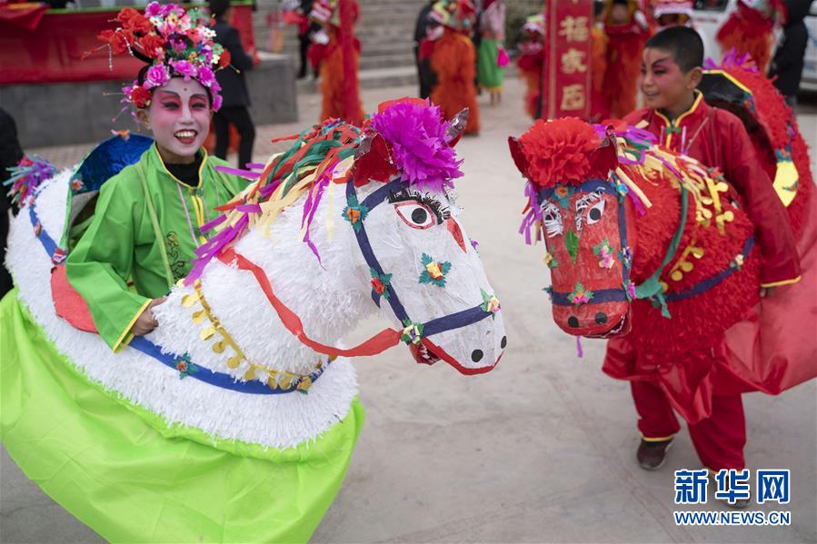 2月19日,在甘肅省隴南市武都區(qū)馬街鎮(zhèn)寺背村,社火隊(duì)演員參加巡游表演。新華社記者才揚(yáng) 攝 -
