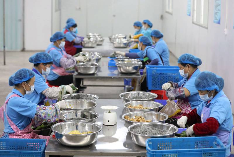 工人們?cè)谲囬g內(nèi)將粽子進(jìn)行真空包裝。龔普康攝