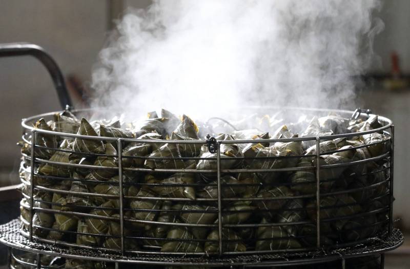 工人們?cè)谲囬g里包粽子。龔普康攝