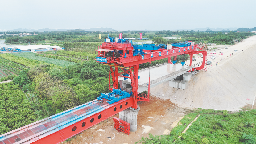 南玉鐵路橫縣白花特大橋首孔箱梁架設(shè)成功。(王志鵬 攝)