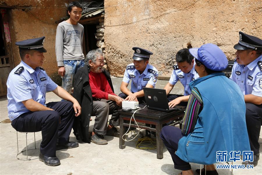 7月20日,在貴州省威寧縣海拉鎮(zhèn)黑多村巖腳組,民警們?cè)跒?7歲的崔發(fā)清老人(左三)采集指紋信息。 2013年以來(lái),貴州省威寧彝族回族苗族自治縣公安局海拉派出所的民警為了解決當(dāng)?shù)乩稀⑷、病、殘等行?dòng)不便群眾辦理二代居民身份證困難問(wèn)題,堅(jiān)持為這些群眾提供預(yù)約上門(mén)辦理身份證服務(wù)。在一些交通不便利的地方,民警們則通過(guò)溜索渡江、翻山越嶺、步行前往的方式,上門(mén)為群眾離線(xiàn)采集指紋、拍攝證件照等,4年多來(lái),當(dāng)?shù)孛窬癁楹@?zhèn)370余名有困難的群眾成功辦理了身份證。 新華社發(fā)(冶付紅 攝)