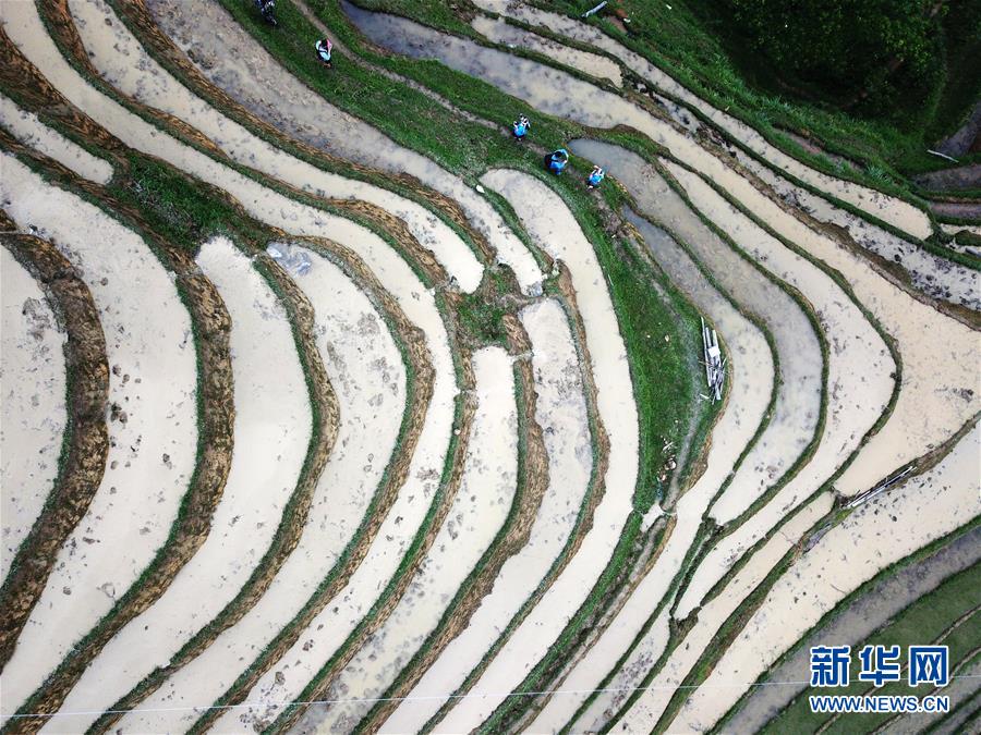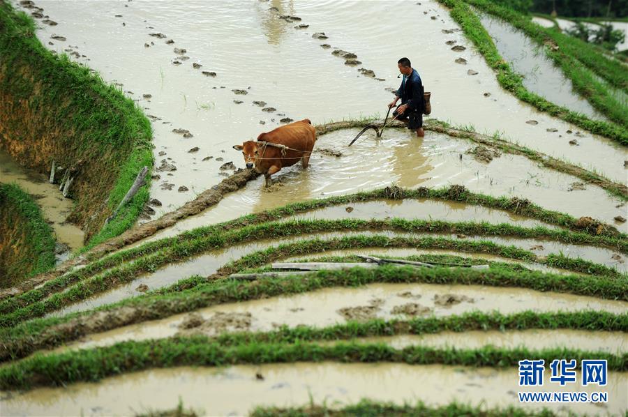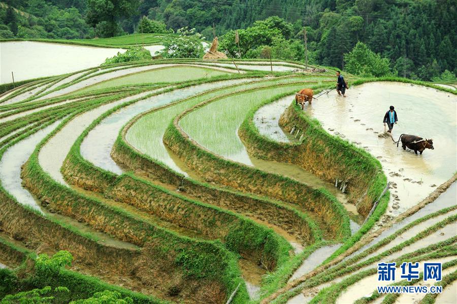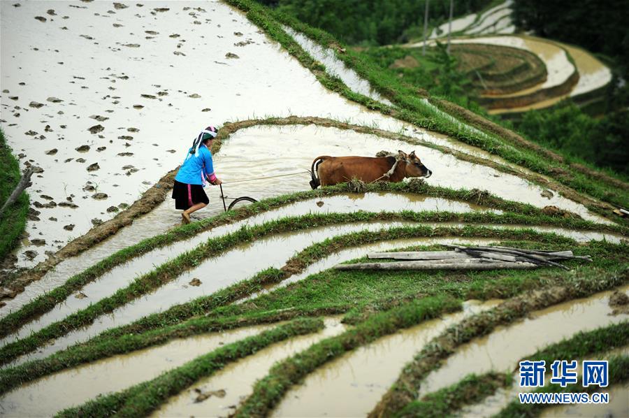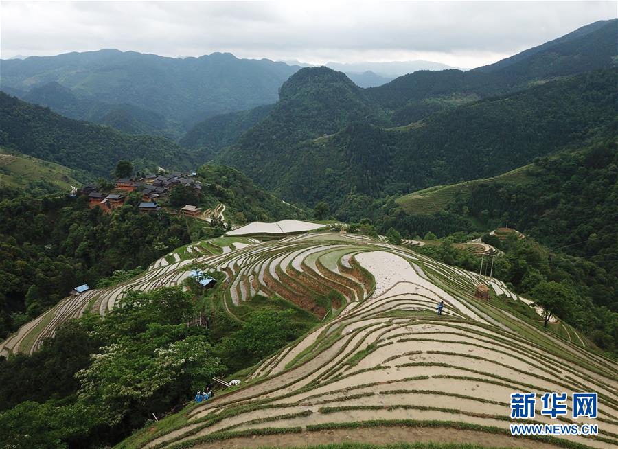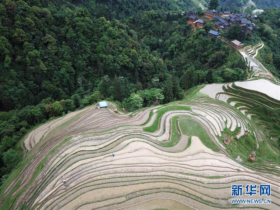 5月7日,貴州省榕江縣計劃鄉(xiāng)陽開苗寨的苗族群眾在耕田。初夏時節(jié),位于貴州省黔東南苗族侗族自治州榕江縣計劃鄉(xiāng)的陽開苗寨層層疊疊的梯田與古樸的苗寨木樓相互映襯,美如畫卷。新華社發(fā)(楊文斌攝) -