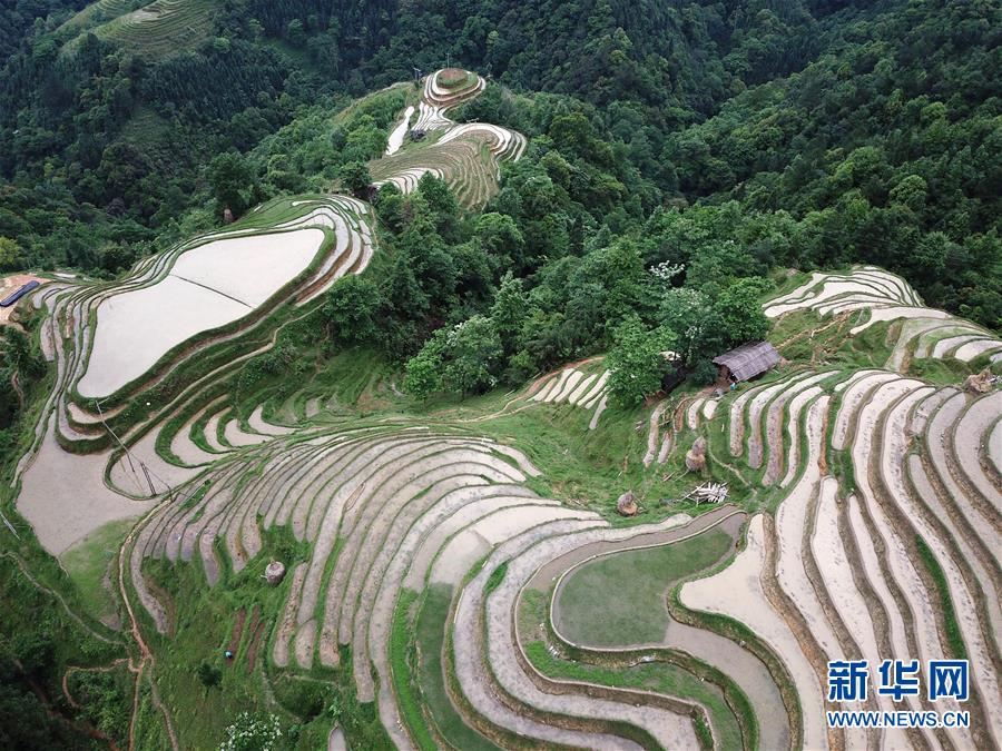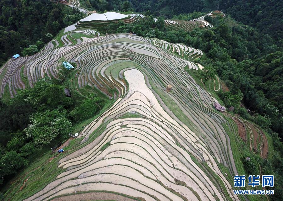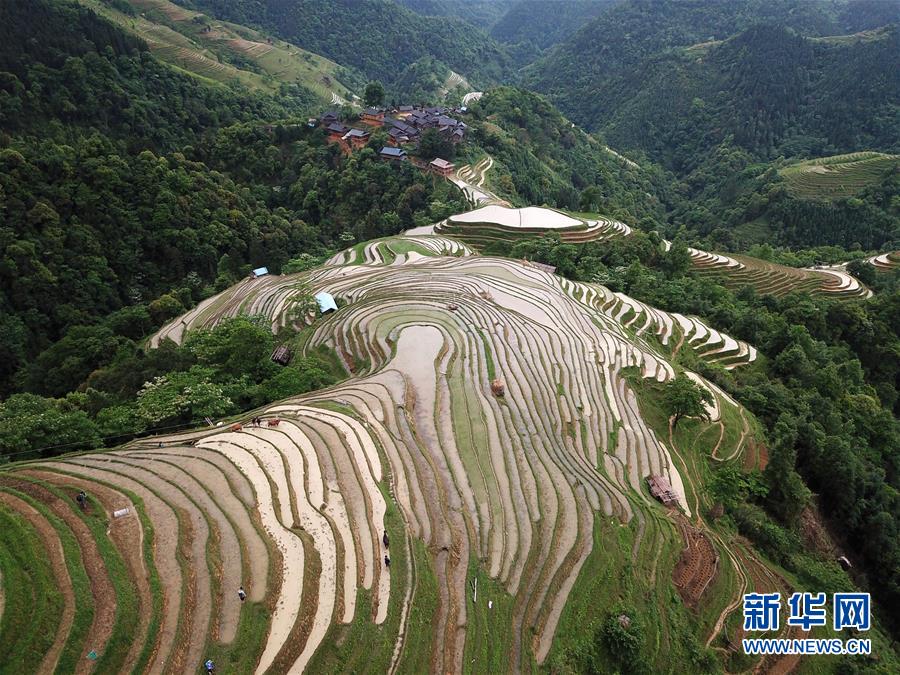 5月7日在貴州省榕江縣計劃鄉(xiāng)陽開苗寨拍攝的苗寨梯田景觀(無人機拍攝)。初夏時節(jié),位于貴州省黔東南苗族侗族自治州榕江縣計劃鄉(xiāng)的陽開苗寨層層疊疊的梯田與古樸的苗寨木樓相互映襯,美如畫卷。新華社發(fā)(楊文斌攝) -