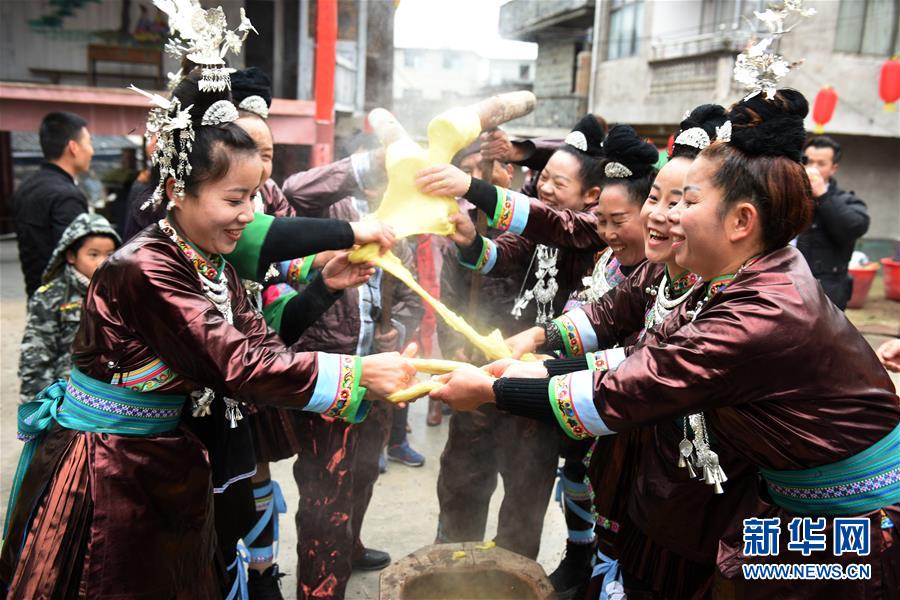 12月9日,貴州省黎平縣中潮鎮(zhèn)佳所侗寨的村民在打糍粑歡度侗年。12月7日至9日,貴州省黔東南苗族侗族自治州黎平縣肇興、佳所等侗寨的侗族同胞身著節(jié)日盛裝,與賓朋歡聚一堂,通過(guò)盛裝巡游、鼓樓對(duì)歌、侗戲展演、舞龍、打年粑等特色民俗活動(dòng),歡度侗年。新華社發(fā)(楊文斌 攝)