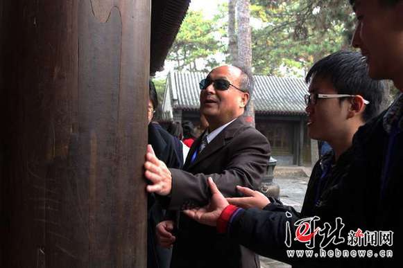 10月15日是第34個(gè)國際盲人節(jié),承德市雙橋區(qū)舉辦了一系列公益活動(dòng),旨在讓更多盲人參與社會(huì)生活,搭建盲人之間、盲人與普通人之間的溝通平臺(tái)。圖為一位盲人正在志愿者的引導(dǎo)下感受避暑山莊景物。 記者陳寶云攝