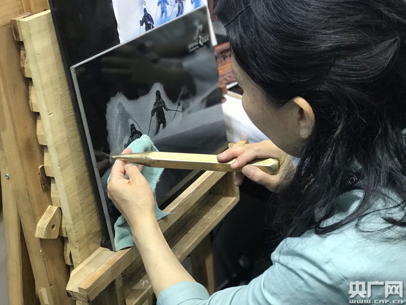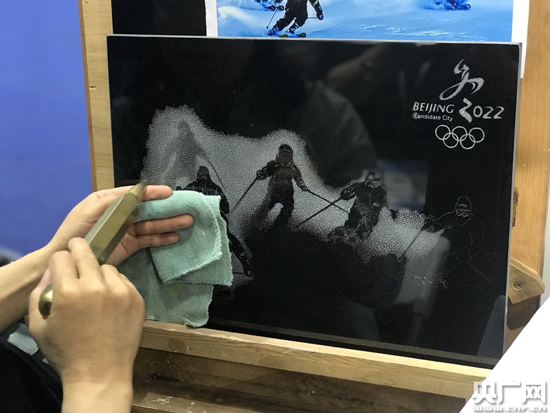 河北省石影雕工藝美術(shù)大師方士英女士現(xiàn)場創(chuàng)作北京冬奧會作品(央廣網(wǎng)發(fā) 閆金楓 攝)
