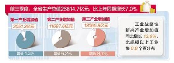 省統(tǒng)計局初步核算,前三季度,全省生產(chǎn)總值26814.7億元,比上年同期增長7.0%。全省經(jīng)濟(jì)運行繼續(xù)保持總體平穩(wěn)、穩(wěn)中有進(jìn)、穩(wěn)中向好的態(tài)勢。