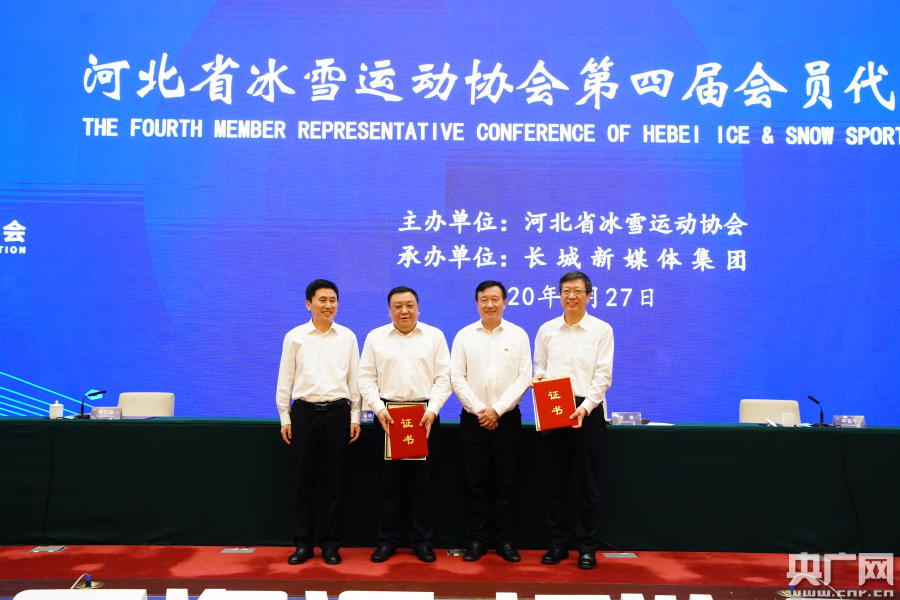 新當(dāng)選的河北省冰雪運(yùn)動(dòng)協(xié)會(huì)主席馬來(lái)順(左二)接受證書(shū)(央廣網(wǎng)發(fā) 許付磊 攝)