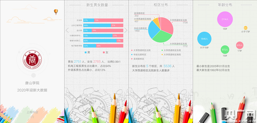 新生入學(xué)當(dāng)天可通過(guò)“現(xiàn)場(chǎng)掃碼”完成報(bào)到信息數(shù)據(jù)統(tǒng)計(jì),系統(tǒng)大數(shù)據(jù)展示屏可實(shí)時(shí)查看學(xué)生報(bào)到情況。迎新結(jié)束后,系統(tǒng)會(huì)用新穎生動(dòng)的畫面,系統(tǒng)會(huì)根據(jù)每一個(gè)學(xué)生的數(shù)據(jù)信息生成一份大數(shù)據(jù)分析報(bào)告。包括新生的男女生比例、地區(qū)分布、民族年齡、出生年月等情況。