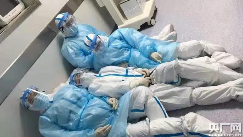 1月6日凌晨5時(shí),換崗后準(zhǔn)備脫下隔離服的醫(yī)護(hù)人員坐在病區(qū)外走廊短暫休息。