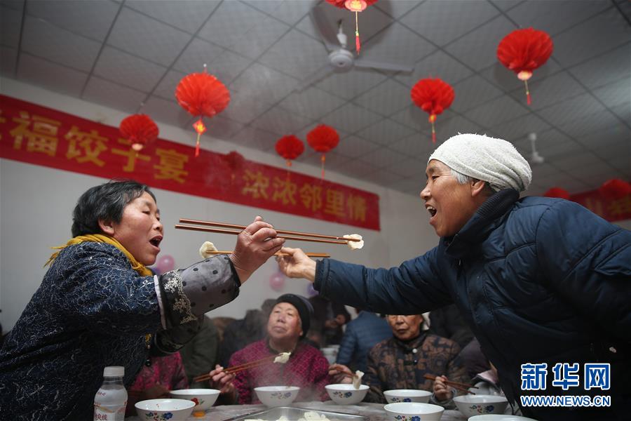 2月21日,在河北石家莊平山縣卷掌村活動中心,村民們用長筷子互相喂食餃子。當(dāng)日,河北省石家莊市平山縣卷掌村舉行“幸福餃子宴”活動,餃子宴上的筷子長達(dá)42厘米,人們只有互相喂食才能方便地吃到餃子,百余名村民在互助互愛中分享快樂。新華社發(fā)(王偉倩 攝) -