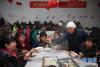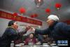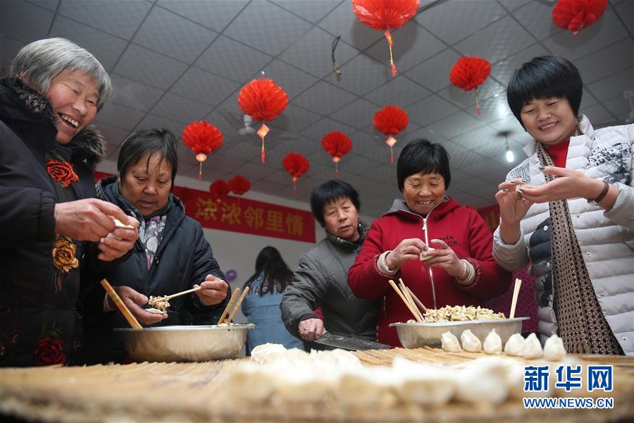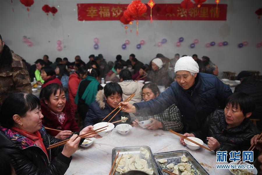 2月21日,在河北石家莊平山縣卷掌村活動中心,村民們使用長筷子吃餃子。當(dāng)日,河北省石家莊市平山縣卷掌村舉行“幸福餃子宴”活動,餃子宴上的筷子長達(dá)42厘米,人們只有互相喂食才能方便地吃到餃子,百余名村民在互助互愛中分享快樂。新華社發(fā)(王偉倩 攝)