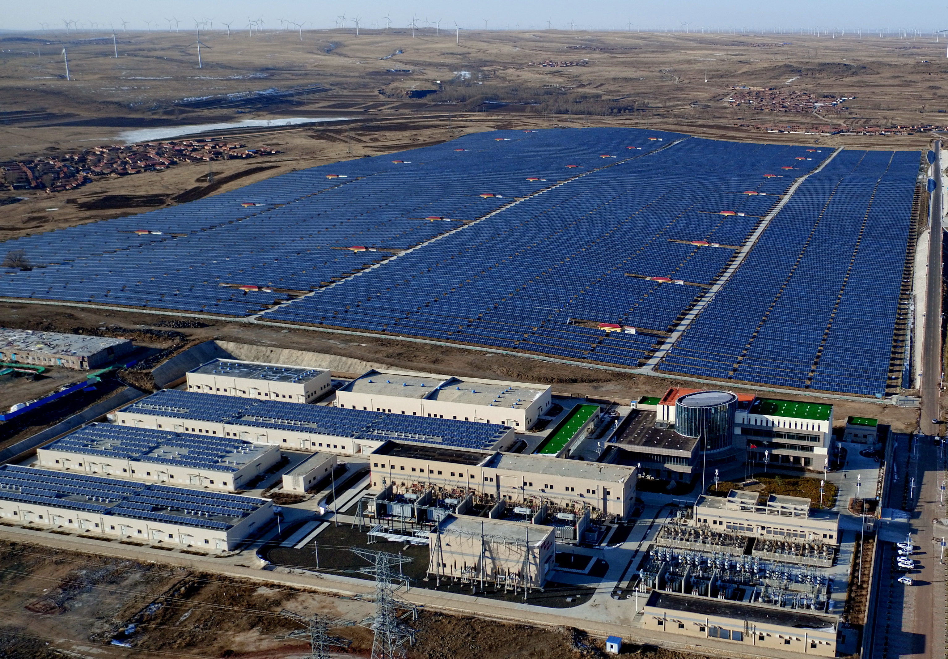 這是張家口壩上地區(qū)的一處光伏發(fā)電場(chǎng)和風(fēng)電場(chǎng)