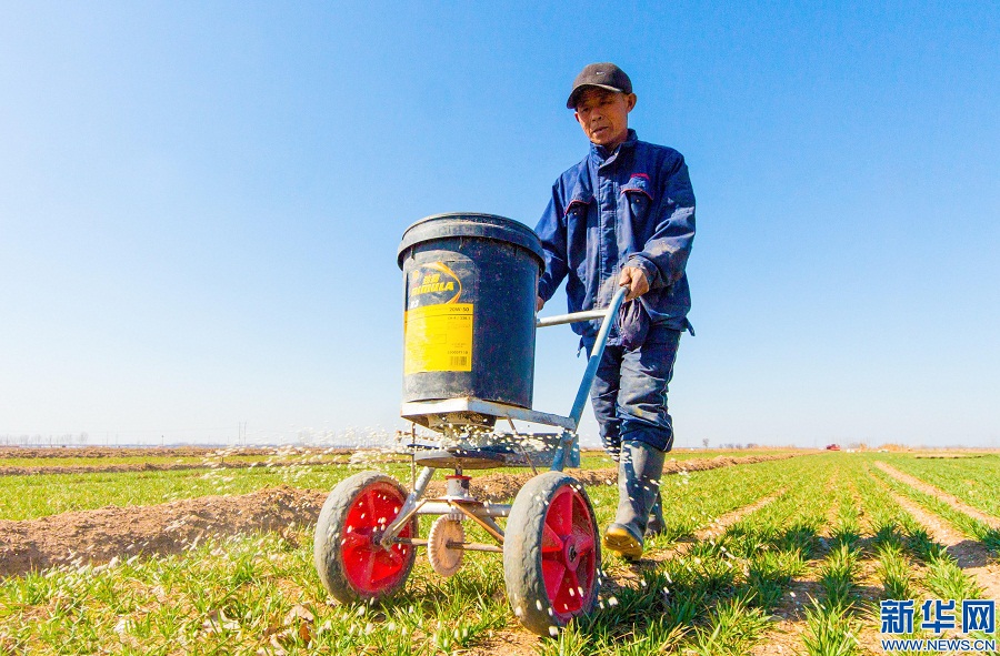 • 3月12日,河北省武邑縣四里屯村農(nóng)民在麥田為小麥?zhǔn)┓。新華社記者朱旭東 攝