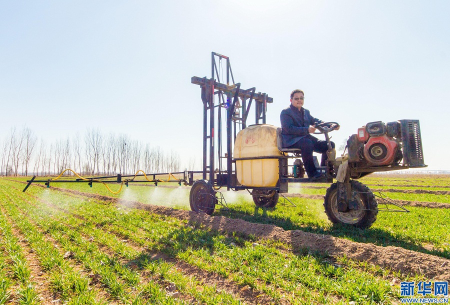 • 3月12日,河北省武邑縣四里屯村農(nóng)民駕駛農(nóng)用機(jī)械在麥田噴灑農(nóng)藥。新華社記者朱旭東 攝