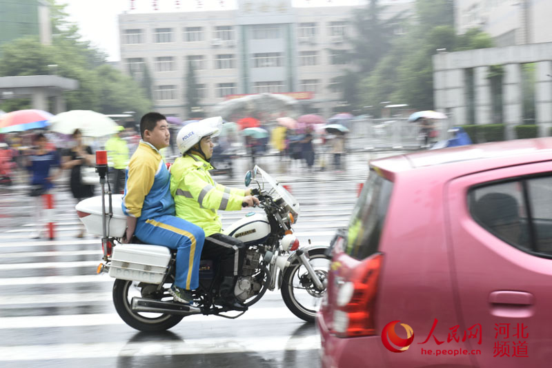 圖為時值中考第二日,石家莊交警冒雨護送中考考生前往考點。 -