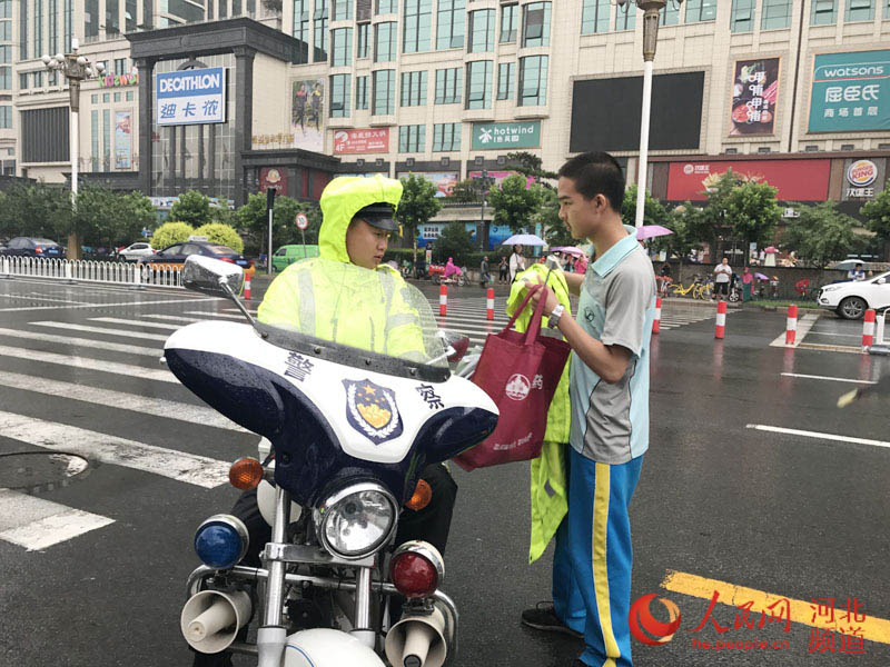 圖為中考考生將雨衣還給交警,并表示感謝。王雅潔 攝 -