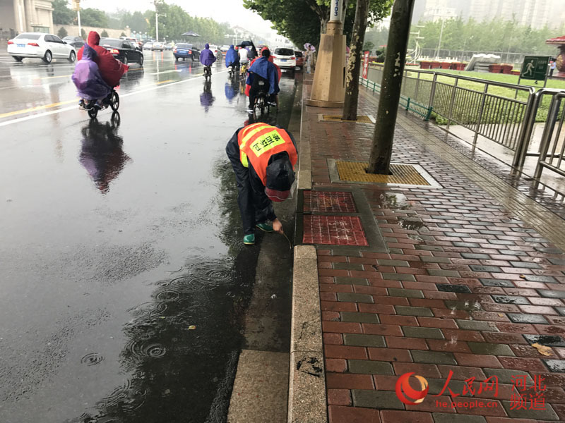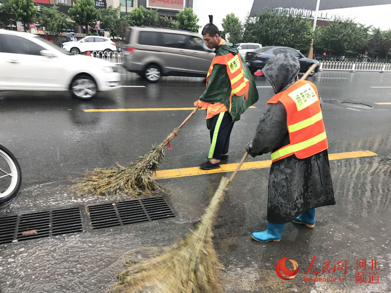 圖為石家莊裕華路街頭,環(huán)衛(wèi)工正在清理街道積水。王雅潔 攝