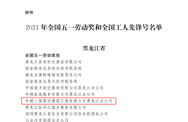 央廣網(wǎng)哈爾濱4月29日消息(記者龐淼 通訊員袁士卿)4月27日,中華全國(guó)總工會(huì)發(fā)布了關(guān)于表彰2021年全國(guó)五一勞動(dòng)獎(jiǎng)和全國(guó)工人先鋒號(hào)的決定,中建二局四公司黑龍江分公司榮獲全國(guó)五一勞動(dòng)獎(jiǎng)狀。